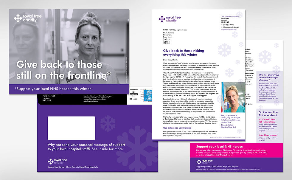 Madcat was approached by the Royal Free Charity to work on strategic direct marketing campaigns during the pandemic, to support NHS staff working tirelessly on the frontline of Covid-19. During the campaign period, the charity went through a rebrand which meant Madcat was involved in the early application of the new Royal Free Charity brand.